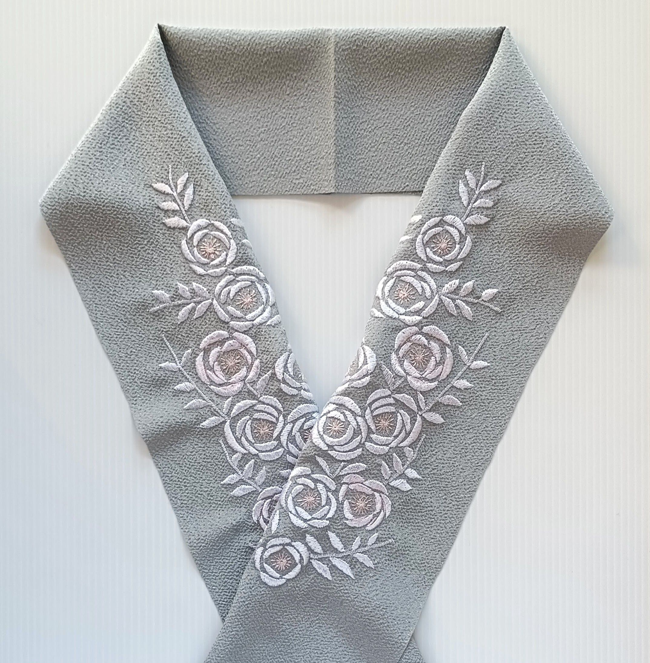 少し青みかかった灰色のちりめん半襟に、白色と薄ピンクの2色で巻き薔薇の刺繍を施しました。
