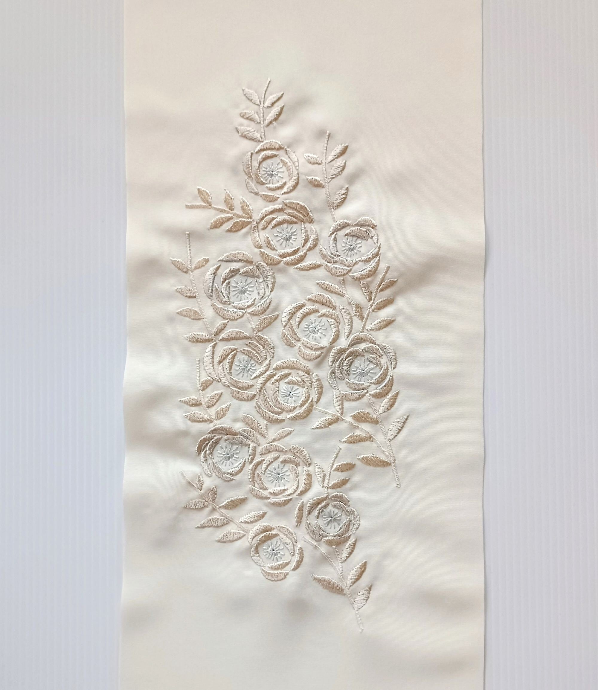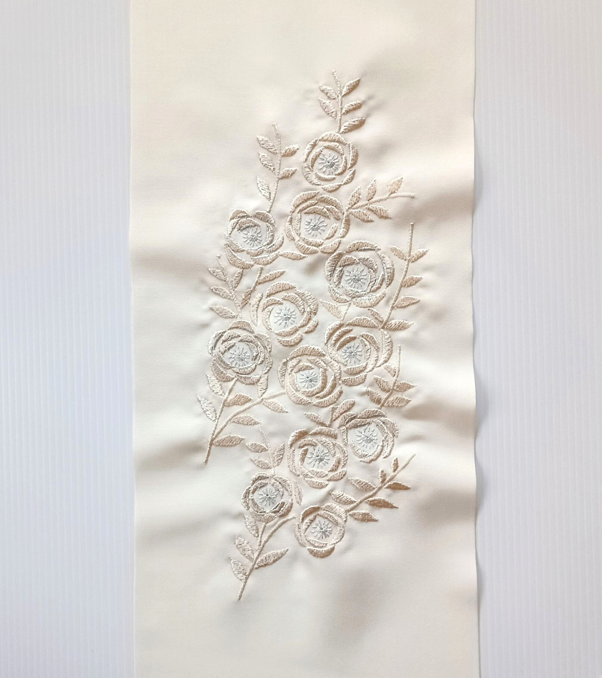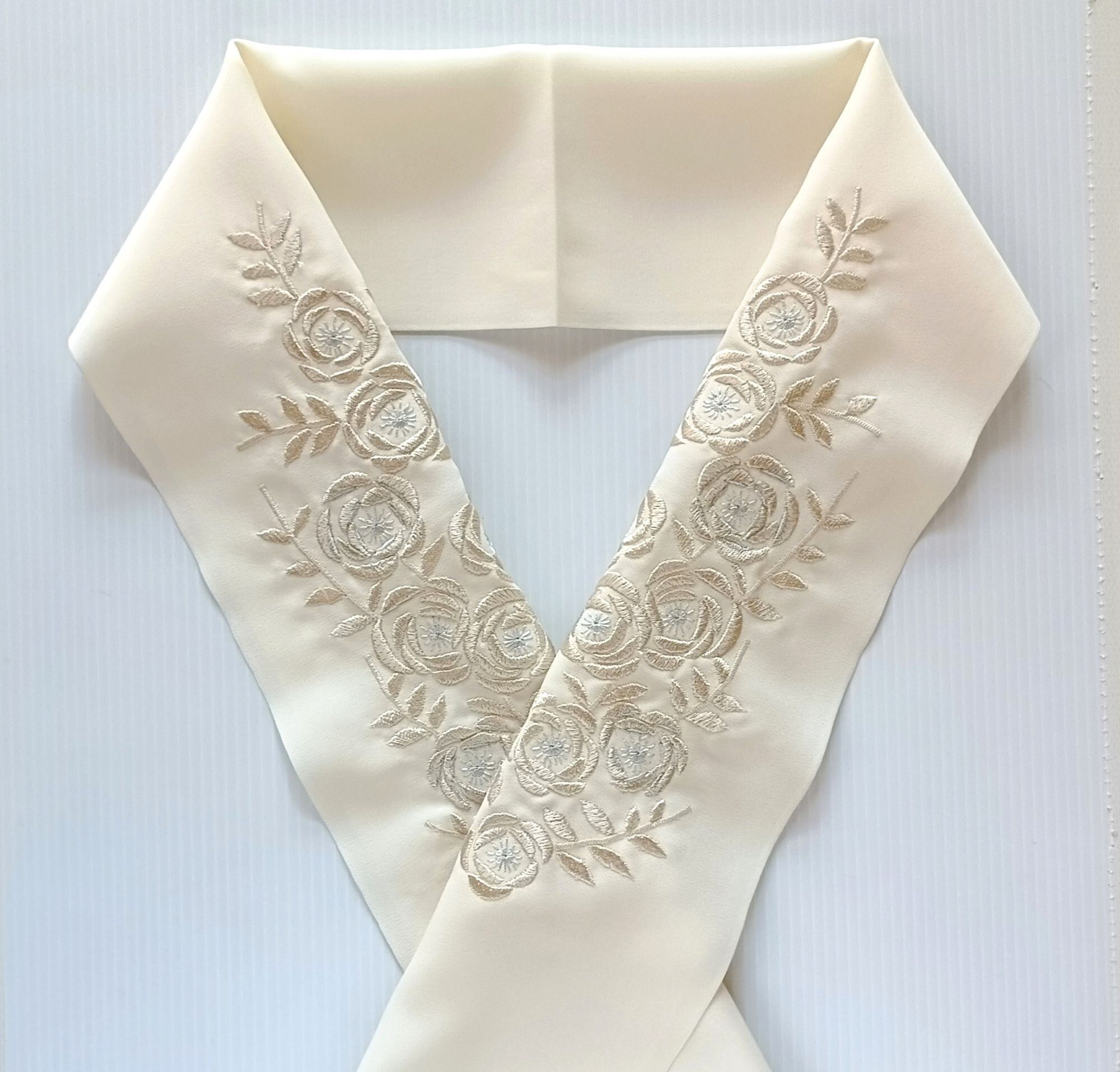 生成り色のシルキーな手触りの半襟に、ベージュと薄グレーの2色で巻き薔薇の刺繍を施しました。