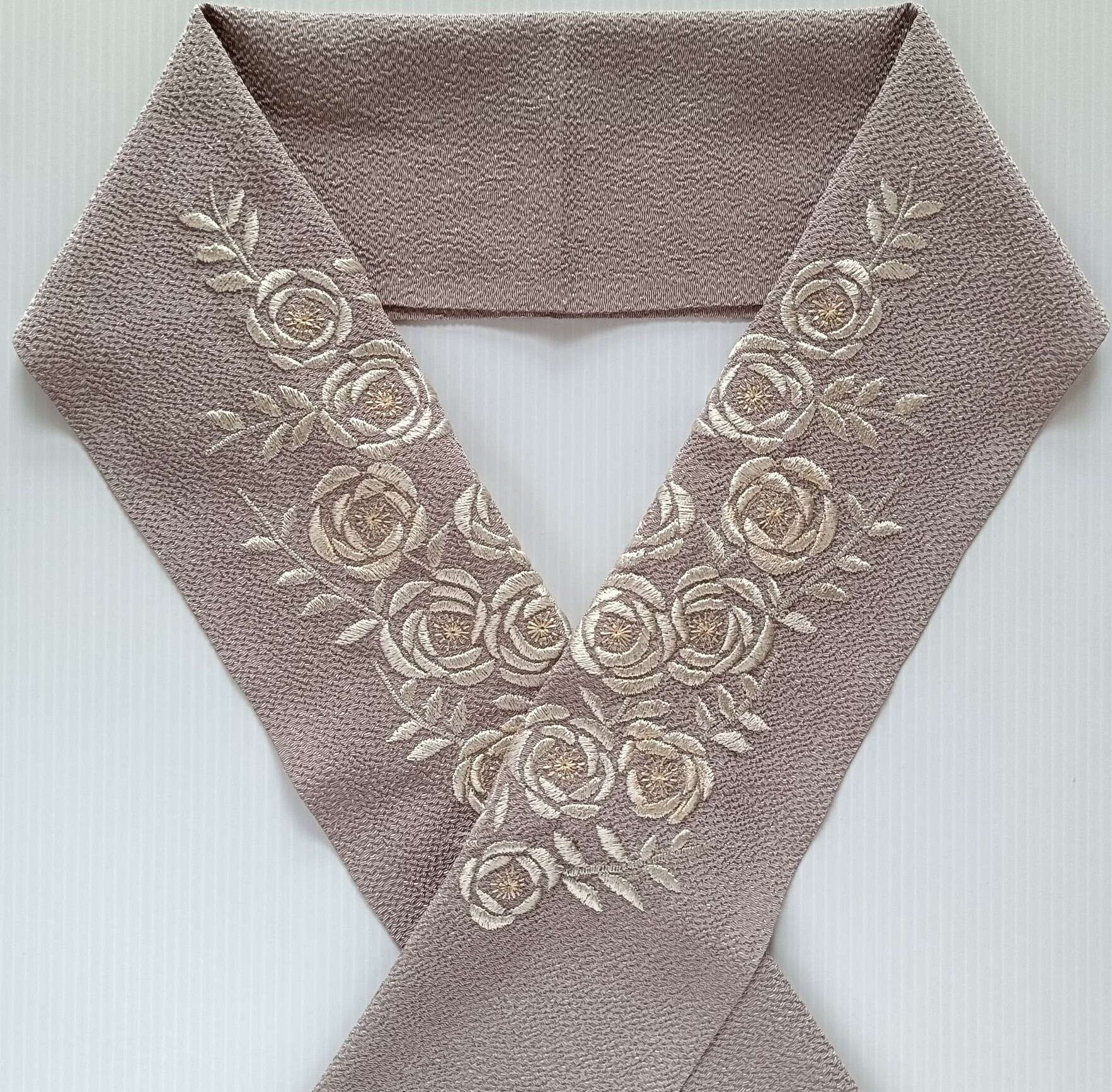 グレージュ色のちりめん半襟に、生成りと薄柿色の糸で巻き薔薇の刺繍を施しました。