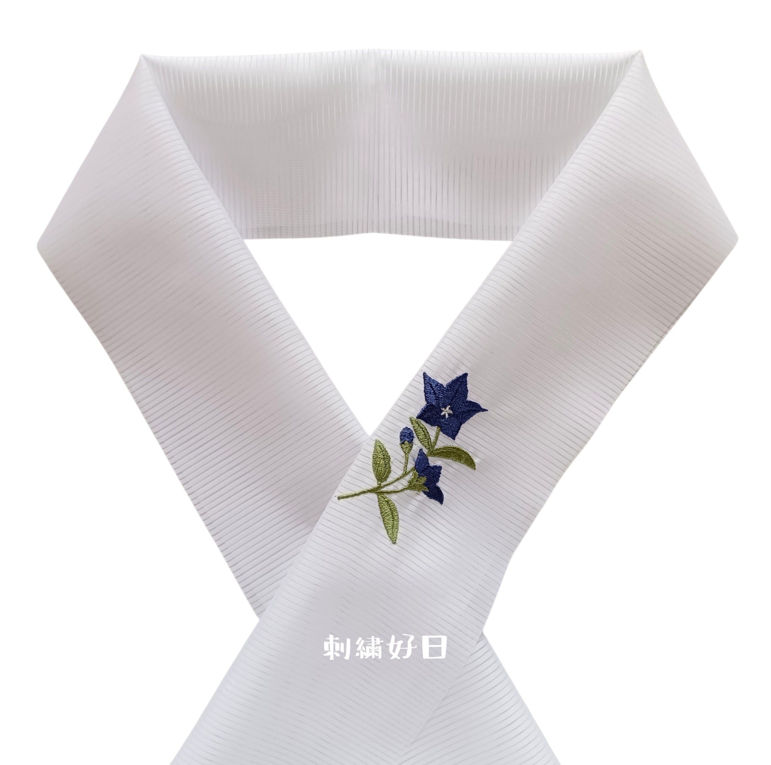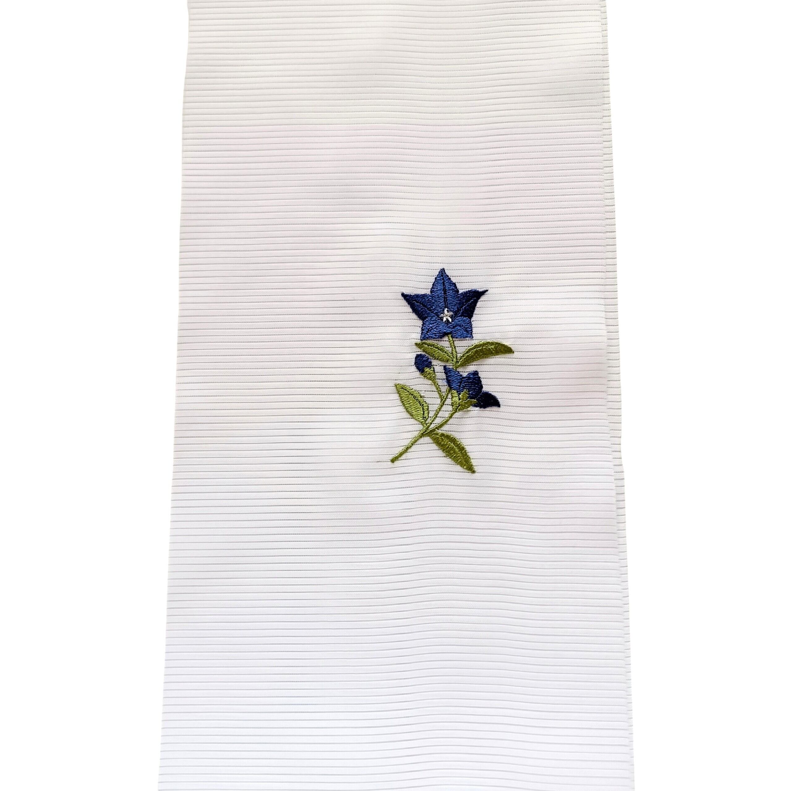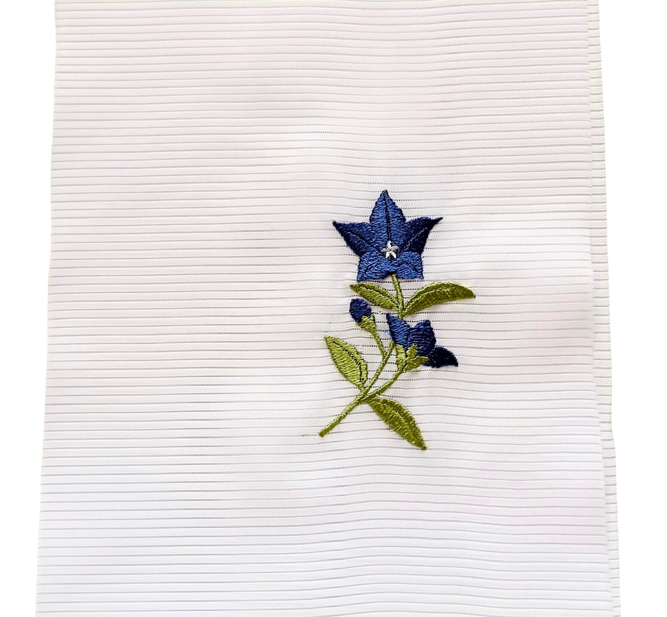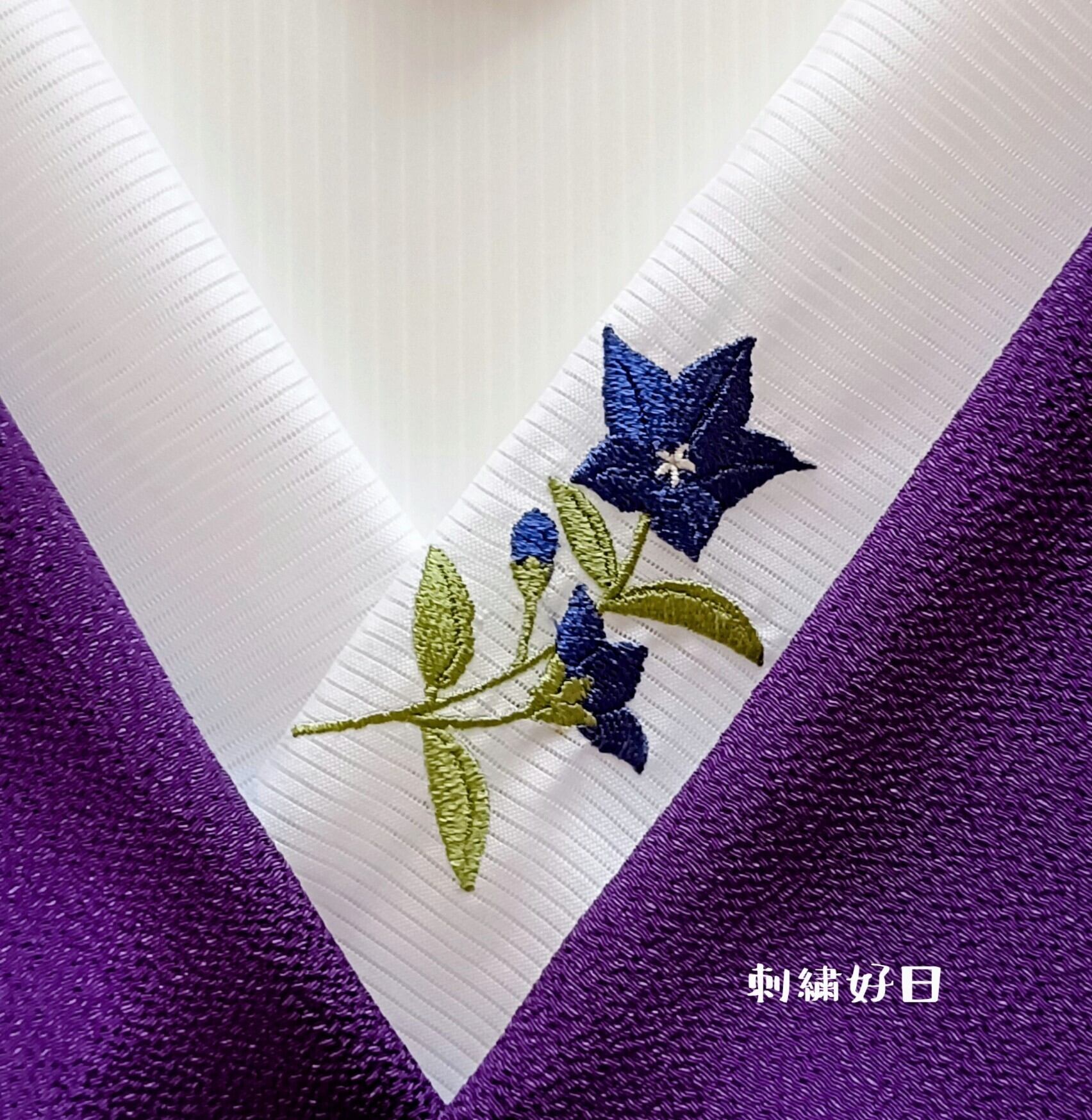 薄手のシャリ感のある半衿に、桔梗をワンポイントで刺繍しました。