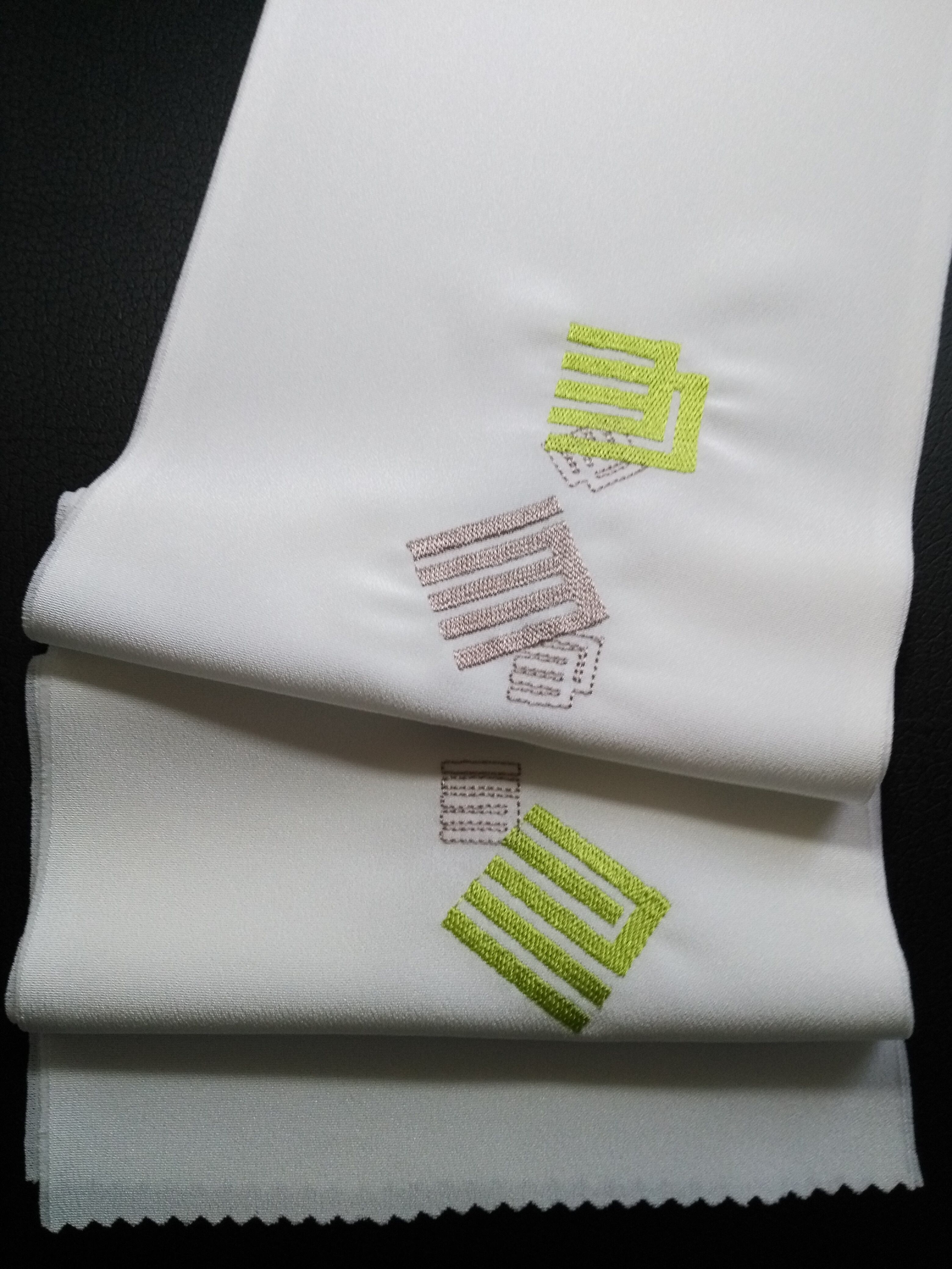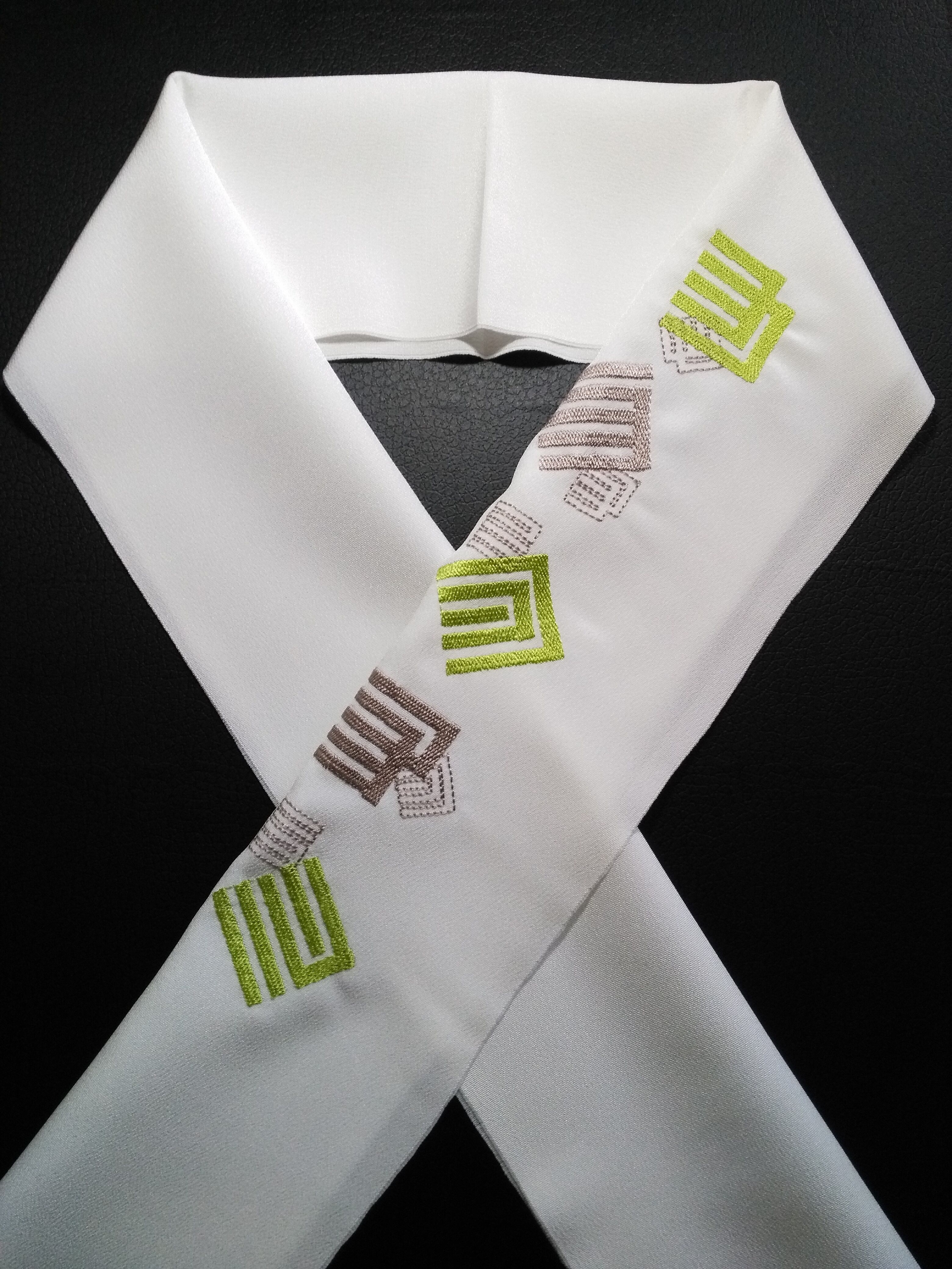 白い半衿にグリーンとモカの2色で源氏香を刺繍しました。