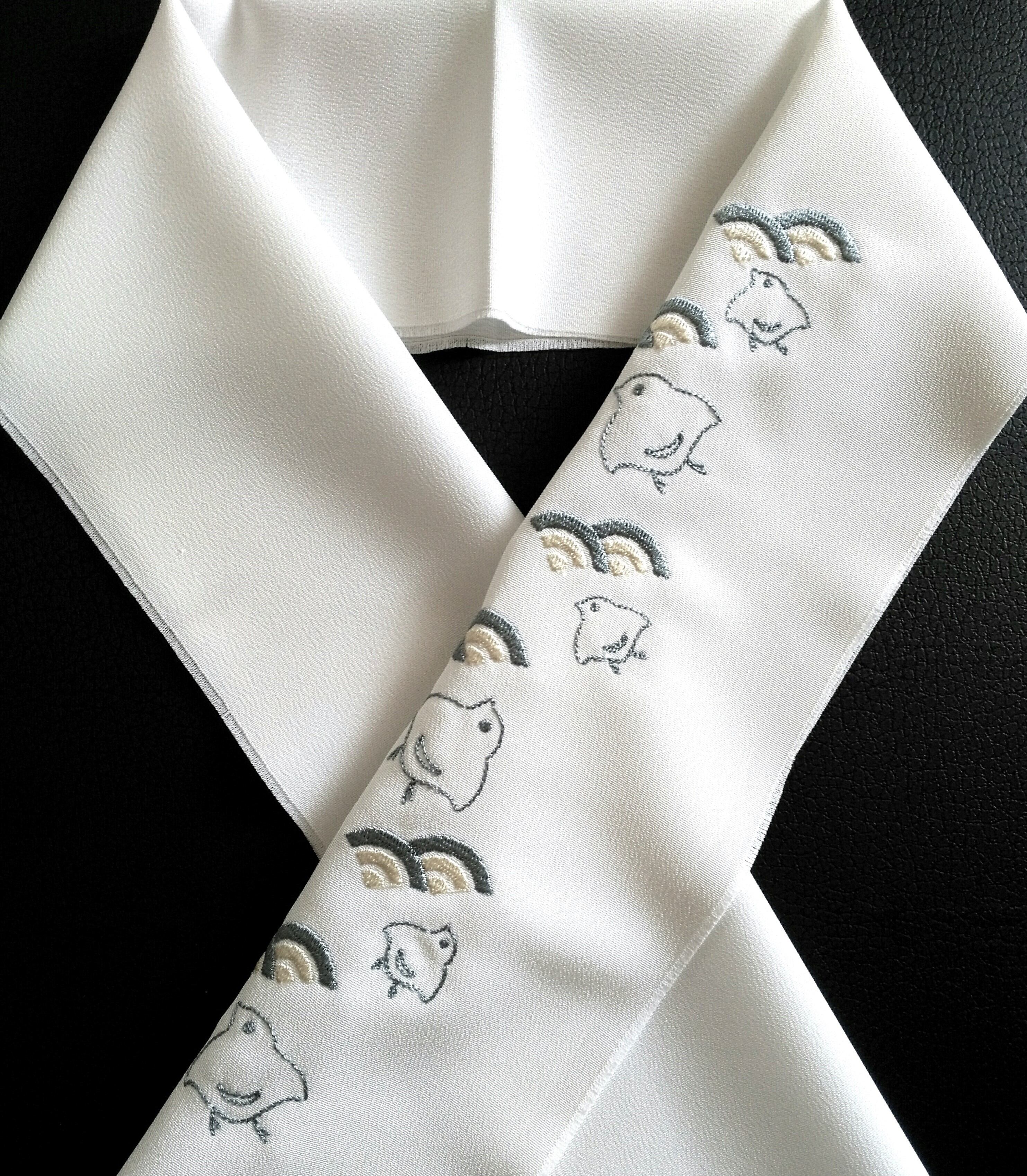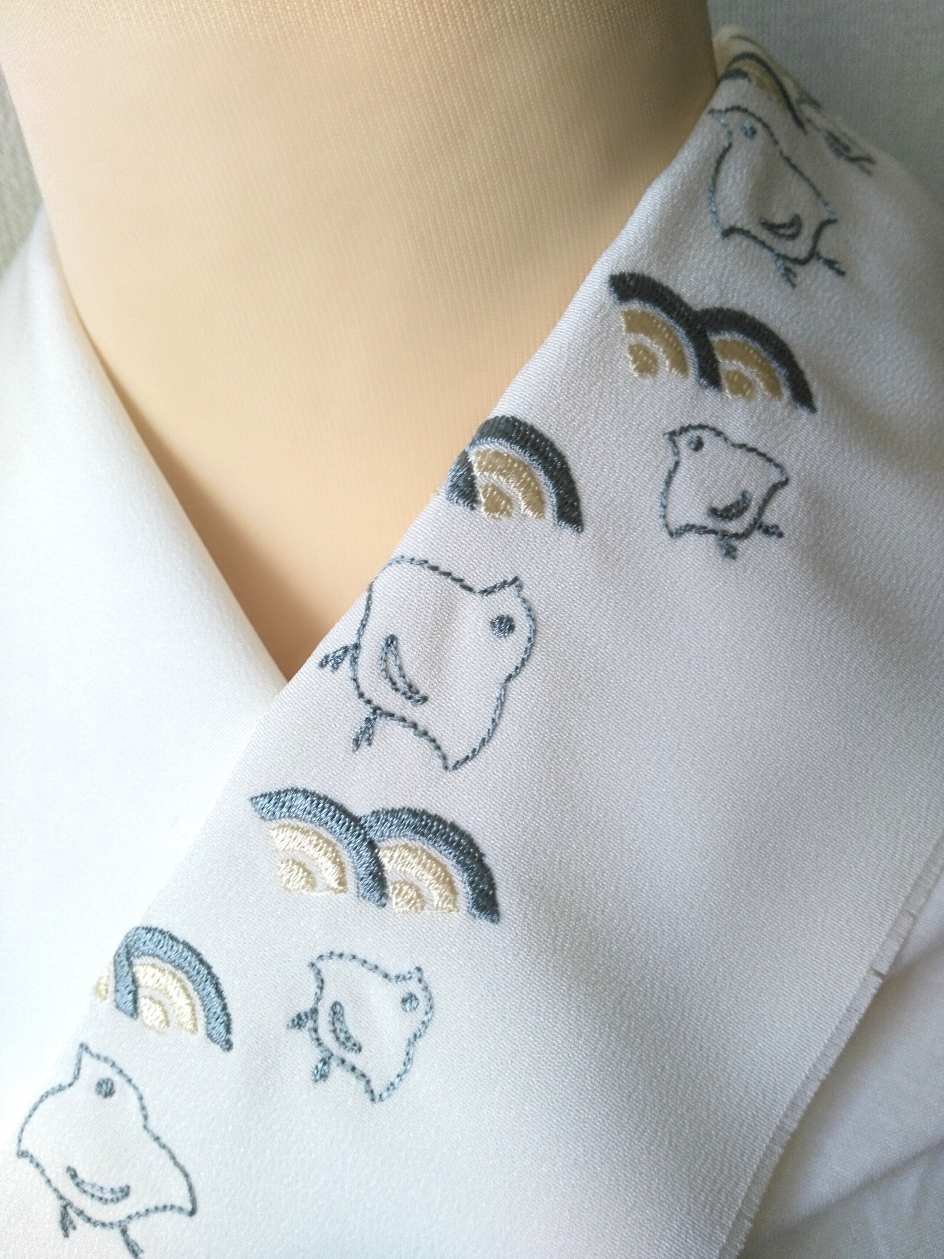 白い半衿に、スモーキーブルーとアイボリーの2色で波千鳥を刺繍しました。