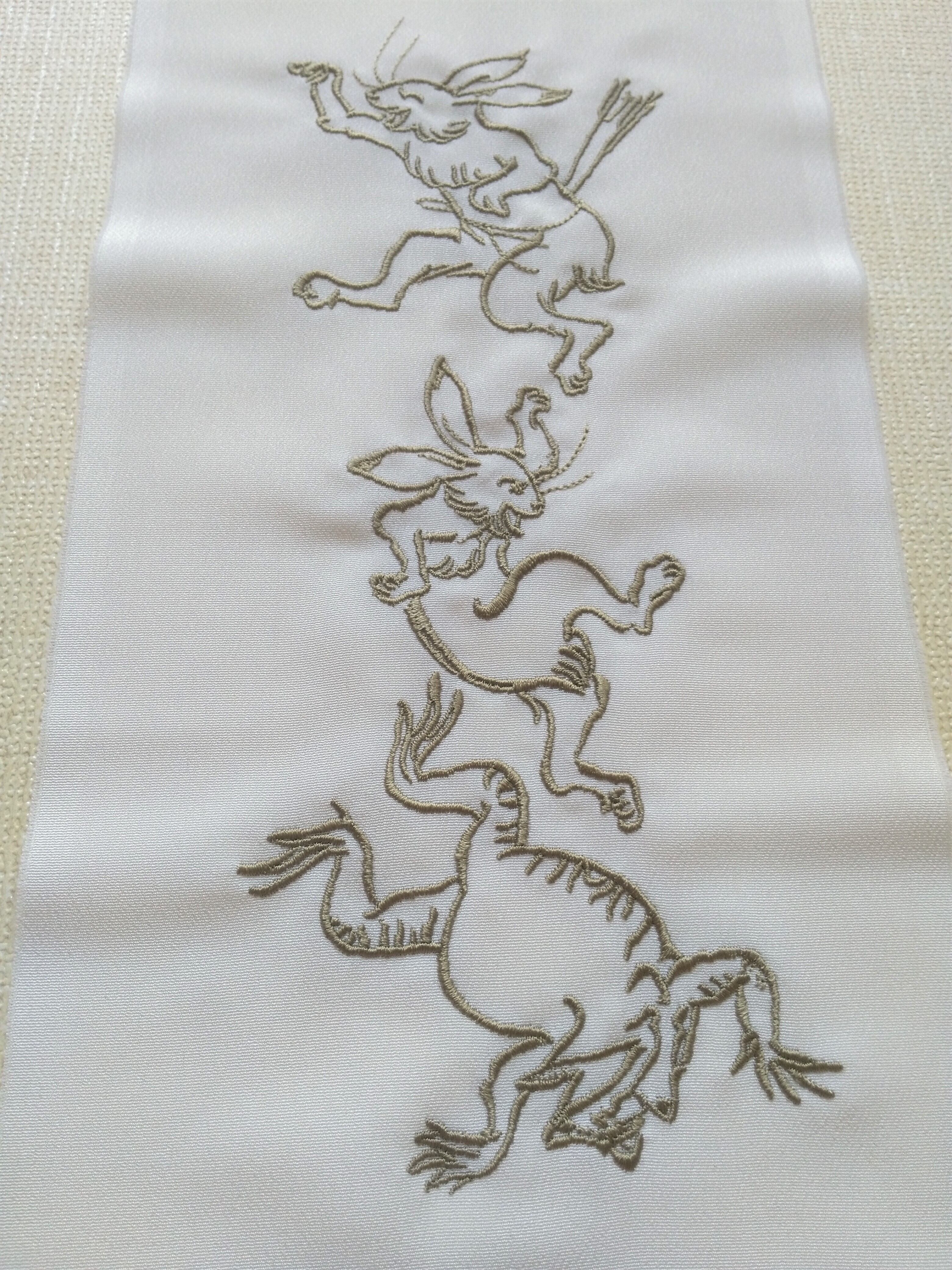 白い半衿にオリーブベージュの糸で鳥獣戯画の蛙、兎、狐を刺繍しました。