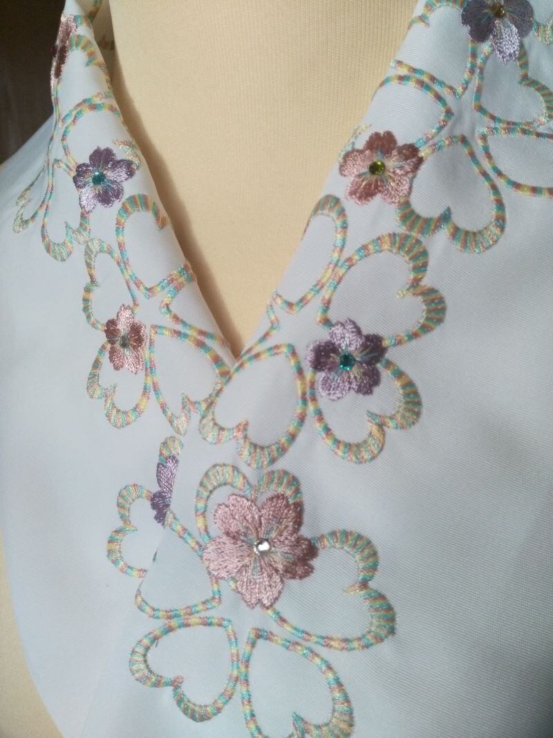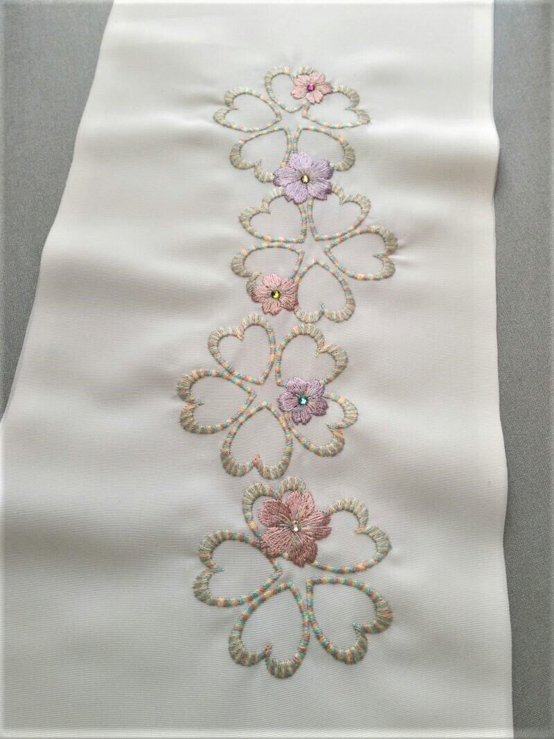 白のシルエリー半衿に桜を刺繍し、ラインストーンを散りばめました。